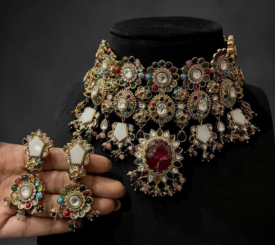 Luxury Best Quality Gold Plated Stones Look Necklace Set With Earrings Function Wedding Party Wear Collection for Women