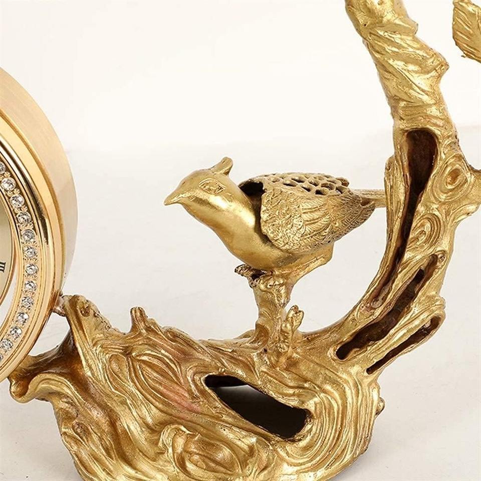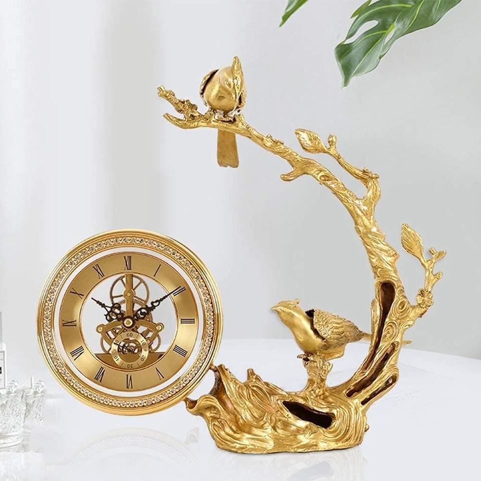 Luxury Bird and Tree Design Gold Clock Centerpiece Stylish Decorative Sculpture for Home Office Wedding Gift Table Decor