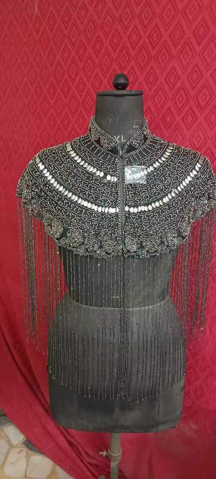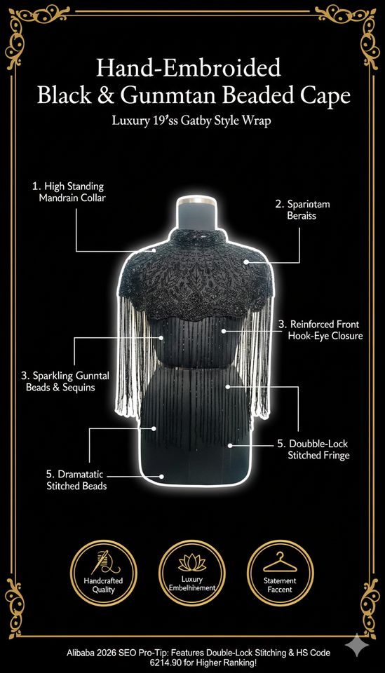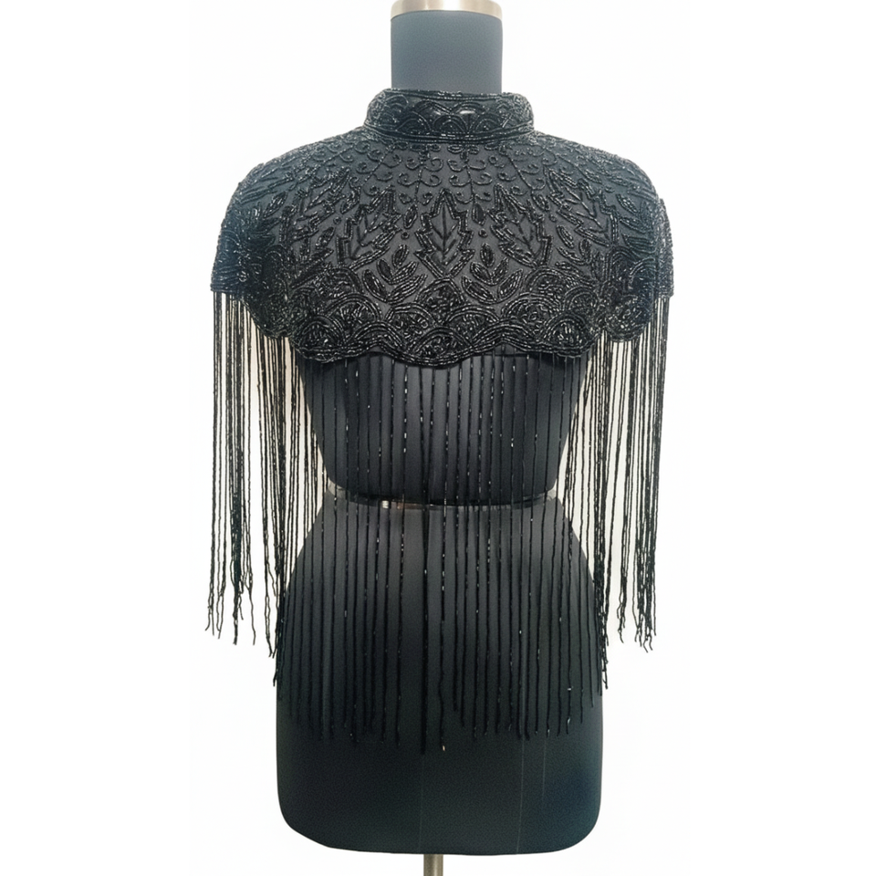 Luxury Black Nylon Beaded Fringe Shawl High Neck Shoulder Cape Women Evening Party Banquet Formal Wear Fashion Accessory Ellora