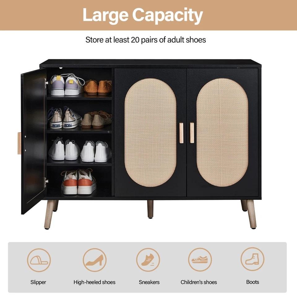 Luxury Black Finish wood and Rattan Three Door Cabinet Storage Unit with Arched Design for Living Room and entryway decor