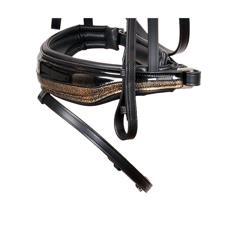 Luxury Black Horse Bridle Glossy Patent Padded Noseband Gold Glitter Trim Comfortable High Quality Made Premium Leather Dressage