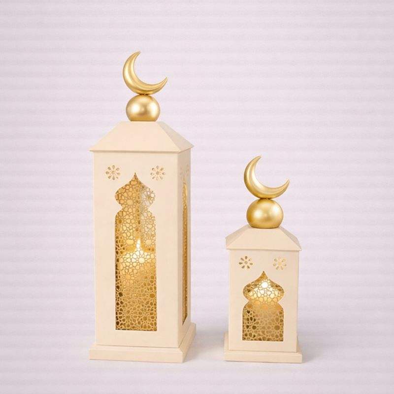 Luxury Black Metal Ramadan Lantern Set with Gold Crescent Top Intricate Cutwork Warm Candle Glow Elegant Home Decor