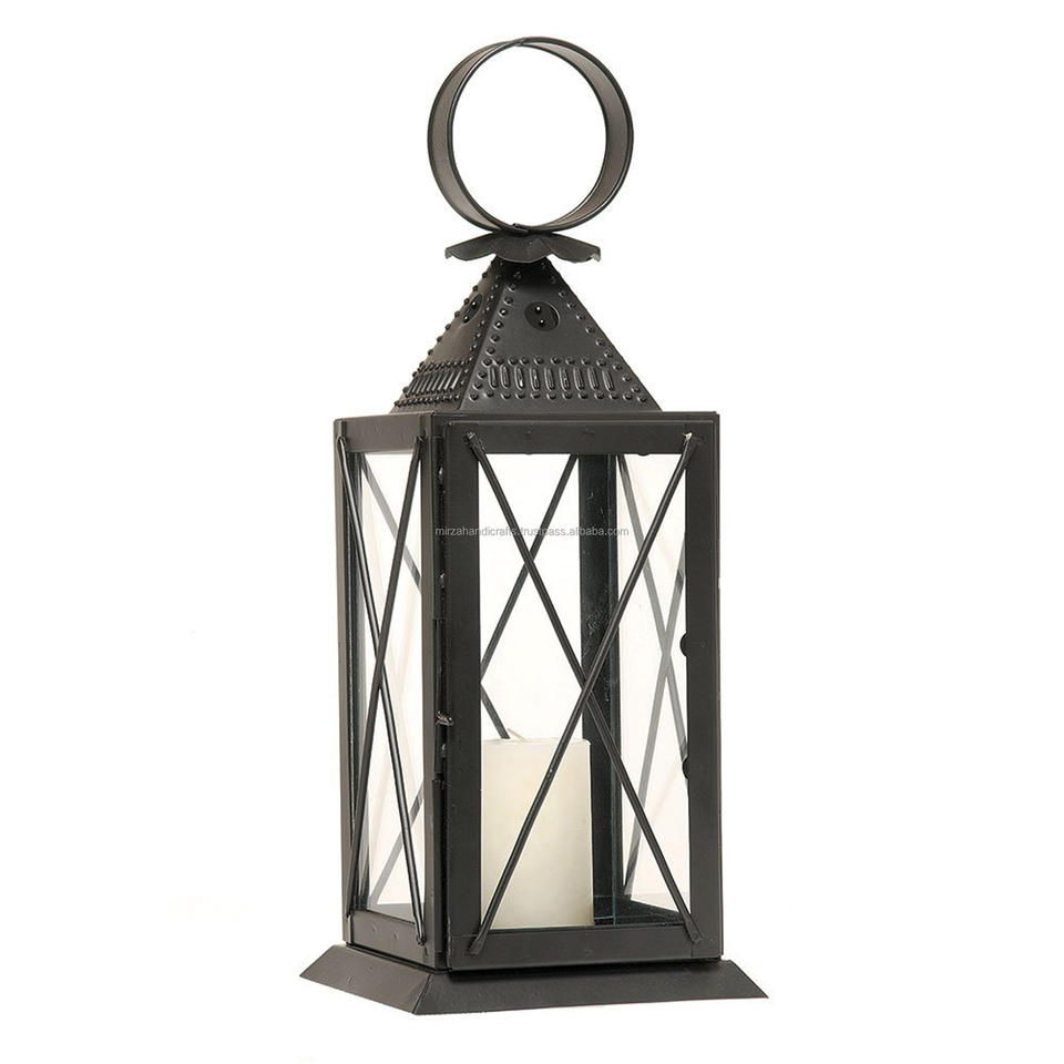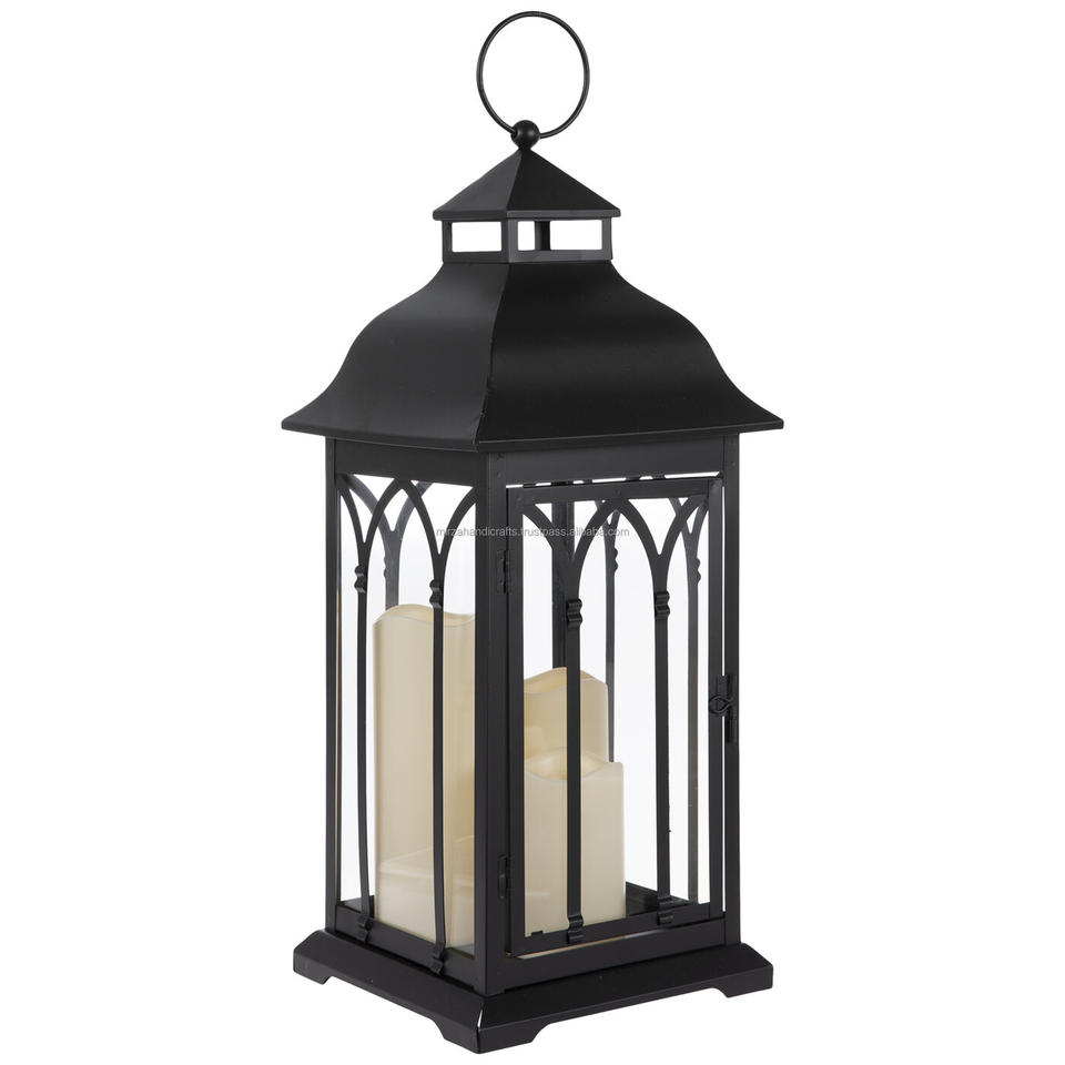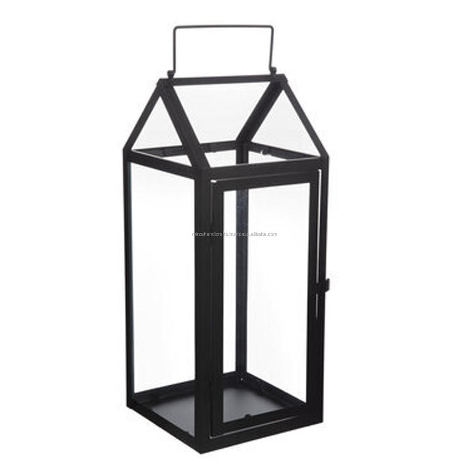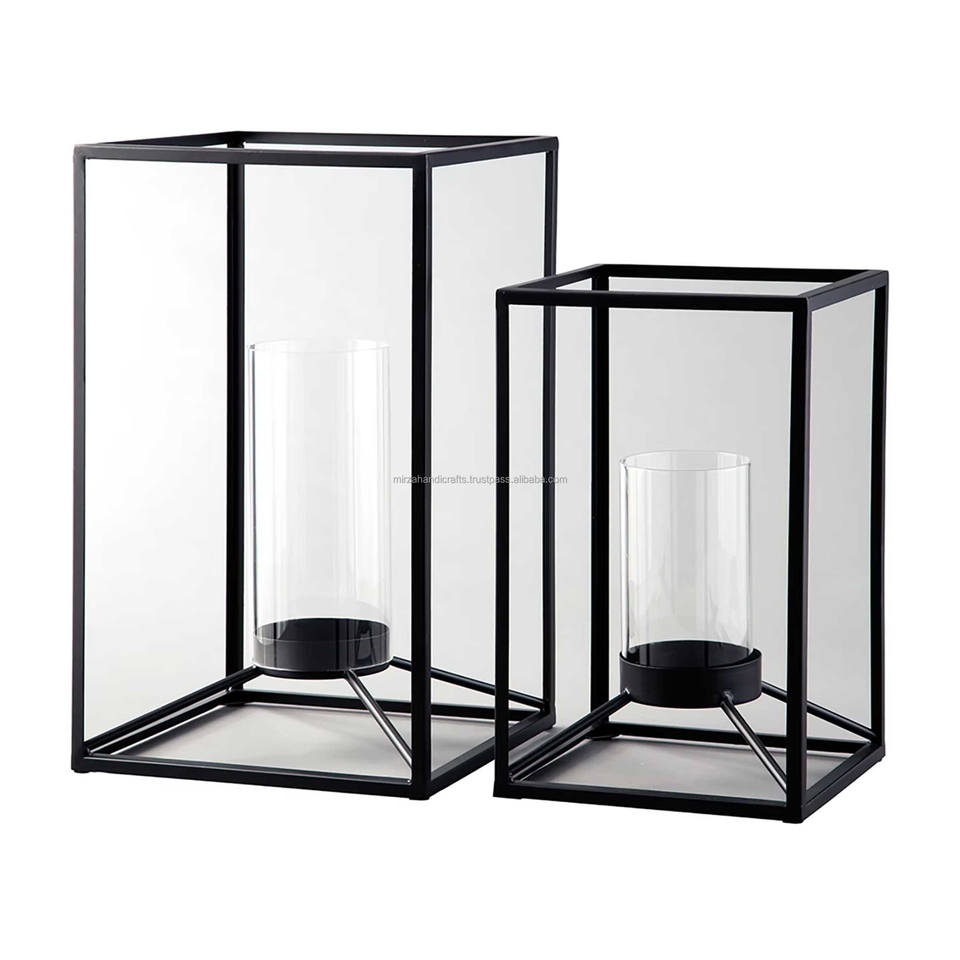 Luxury Black Metal Square Lantern Candle Holder Handmade Metal Frame with Four Glass Sides Hanging Pillar Candle Lanterns