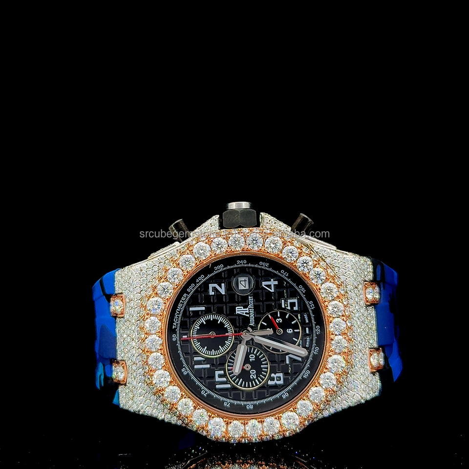 Luxury Blue Camo Rubber Strap Iced Out Watch - Chronograph Rose Gold Bezel Moissanite Watch - Bust Down VVS Diamond Sport Watch