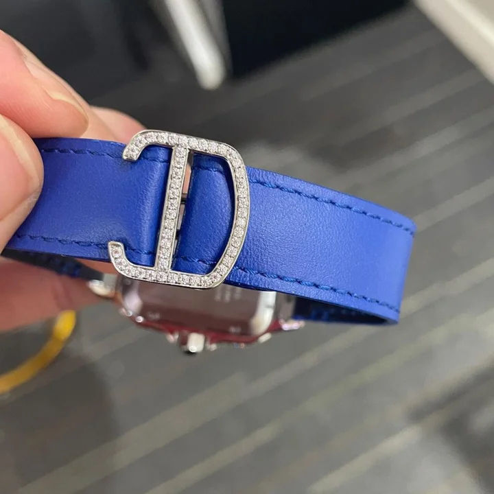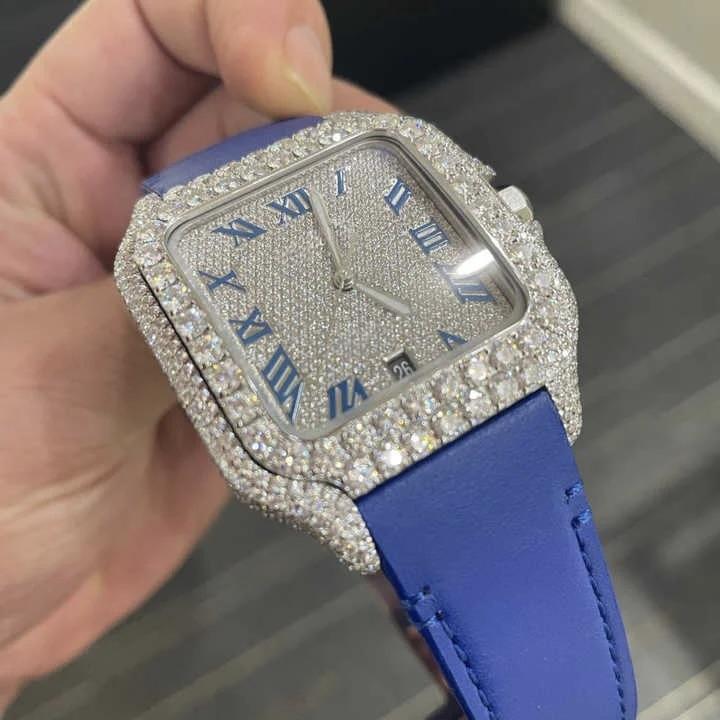 Luxury Blue Leather Strap Automatic Mechanical Sports Watch Half Iced Fully Hand Set VVS Moissanite Diamonds Stainless Analog