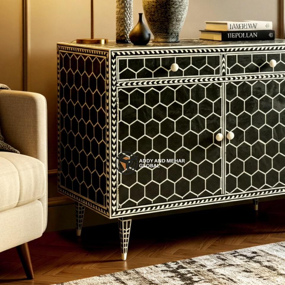 Luxury Solid Wood Bone Inlay Sideboard with Black & White Sunburst Design and Wooden Legs for Home Bar and Living Room