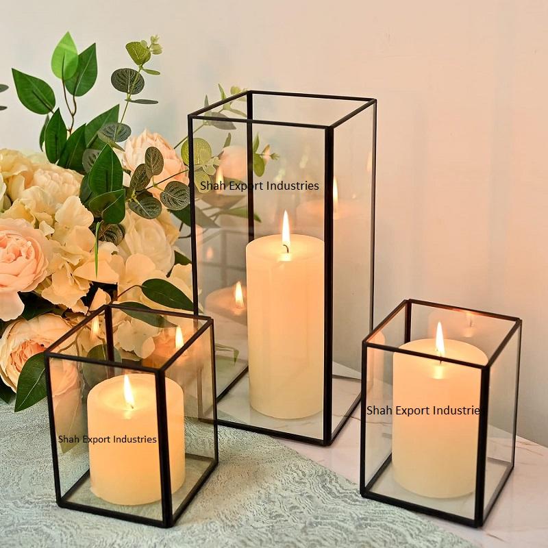 Luxury Brass Frame Glass Box Candle Holder Set for Wedding Table Decoration Centerpiece Black Square Candle Votive