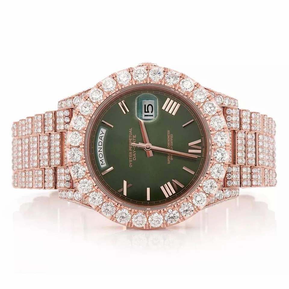 Luxury Business Iced Out Moissanite Watch Rose Gold Green Dial for Automatic Mechanical Diamond Butterfly Clasp