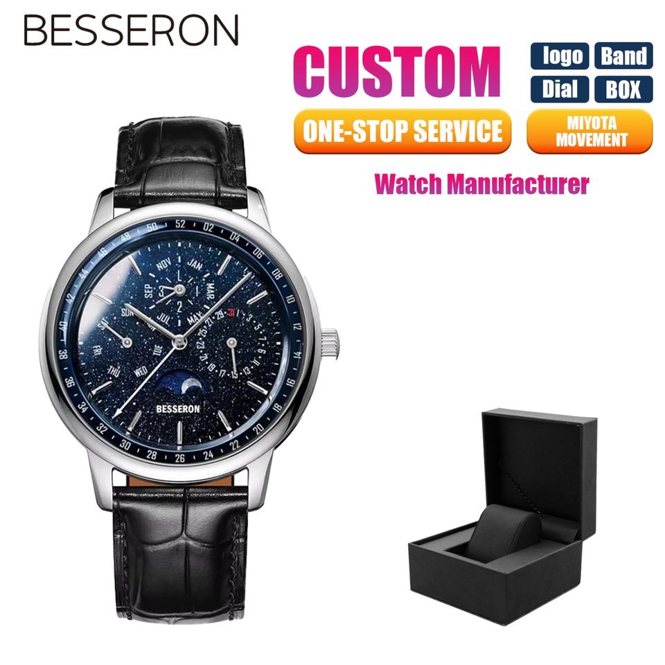 Luxury Business Men's Automatic Mechanical Watch Sapphire Crystal Dial Luminous Hands Black Stainless Steel Leather Strap Water