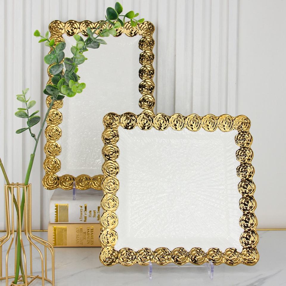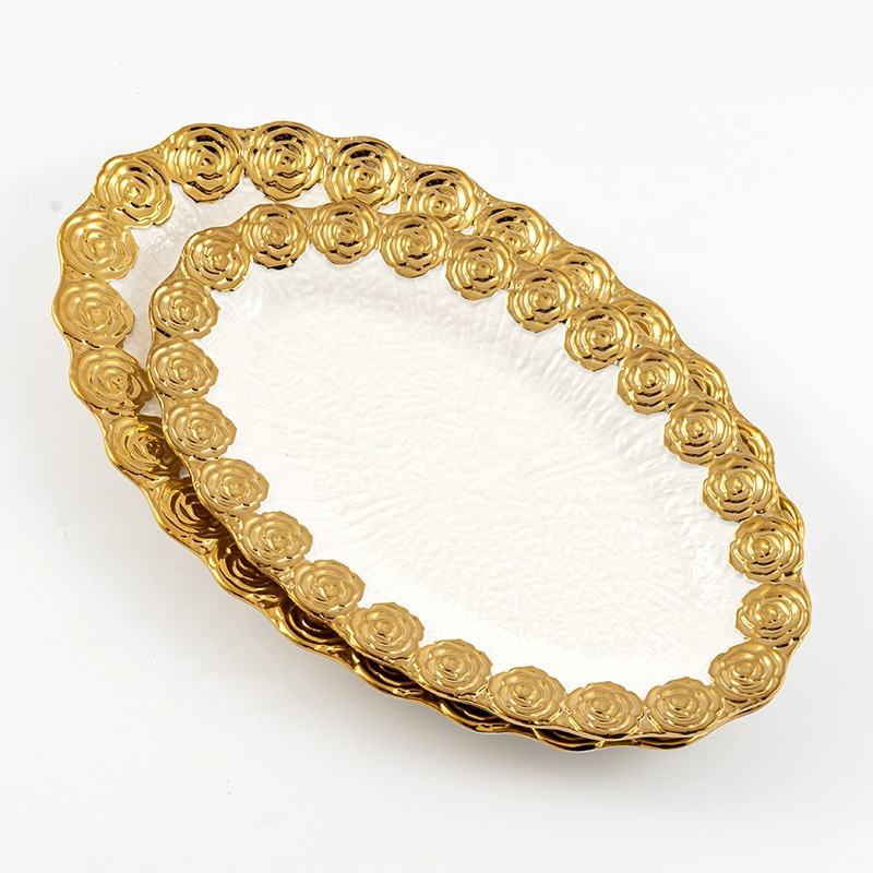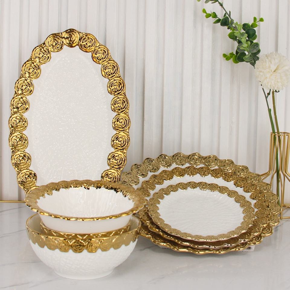 Luxury Ceramic Salad Breakfast Bowls Restaurant Steak Barbecue Plates Wedding Gold Rose Rim Dinnerware Sets