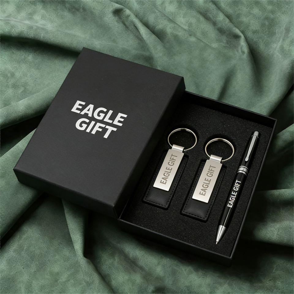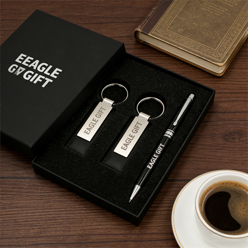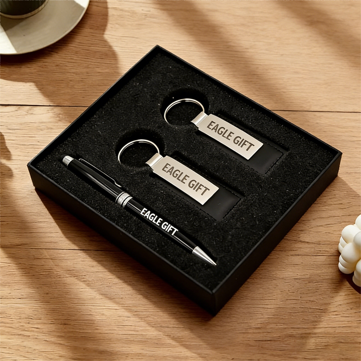 Luxury Corporate Promotional Stainless Steel 2 Keychains 1 Pen Gift Set with Custom Logo & Color Silk Screen Printed