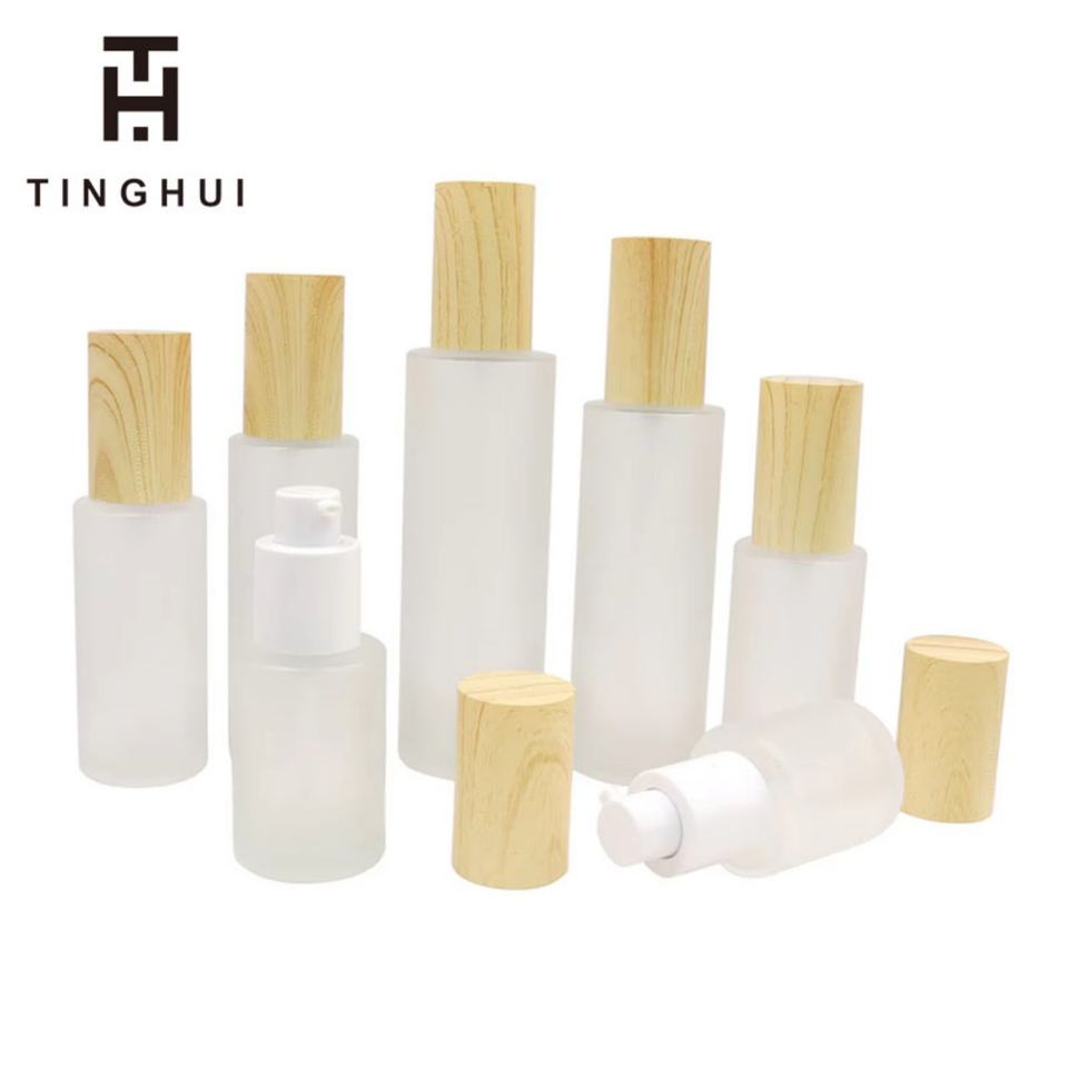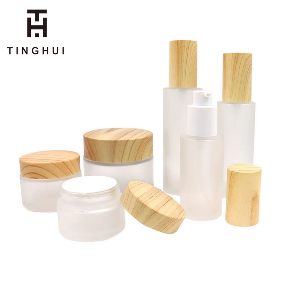 Luxury Cosmetics Packaging Glass Bottle Sets Bamboo Lid Cream Jar and Pump Spray Bottle Set Skincare Face Cream Lotion Bottle