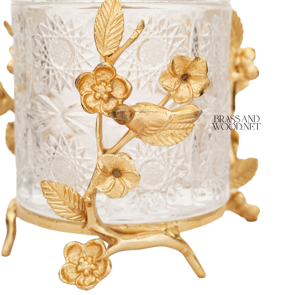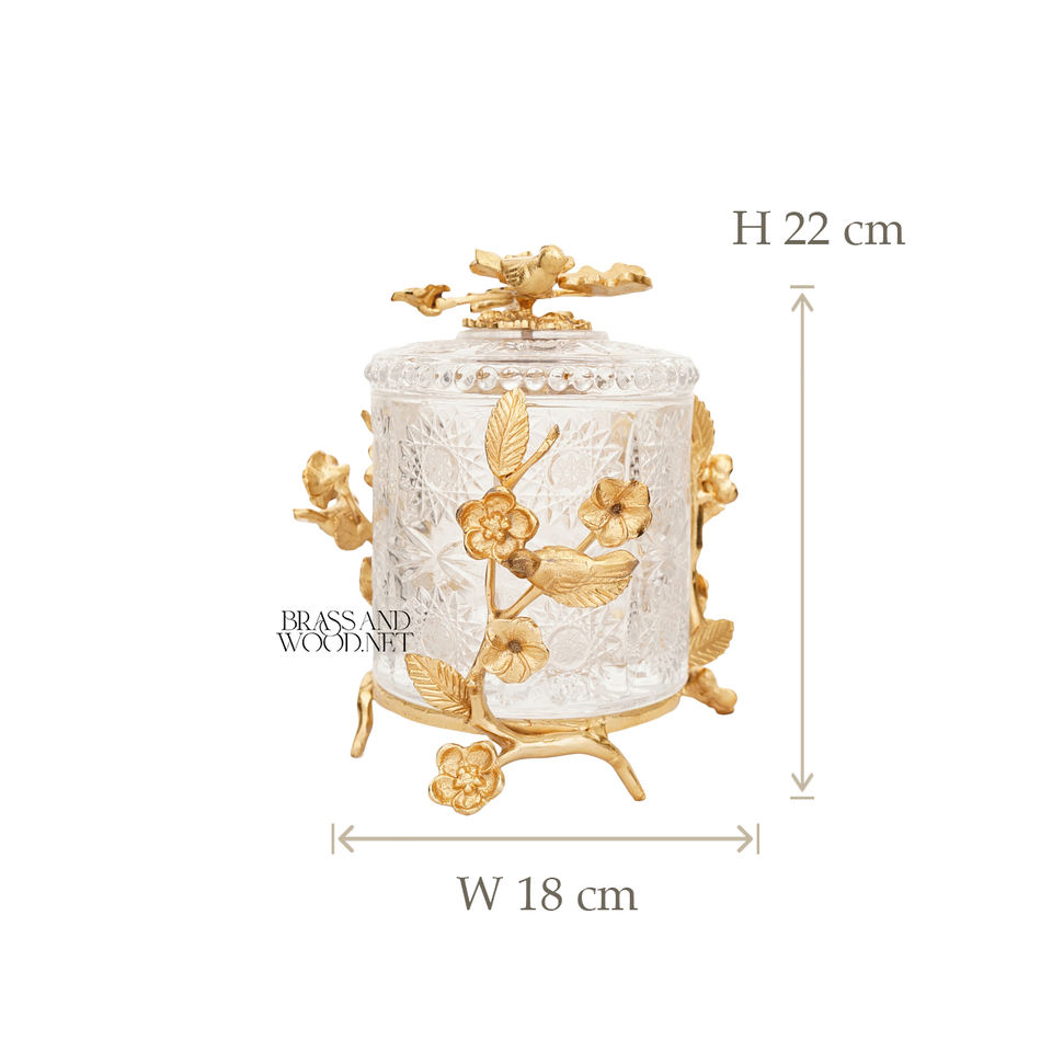 Luxury Crystal Bonbonniere with Gold Floral & Bird Accents Decorative Candy Jar Elegant Table Display