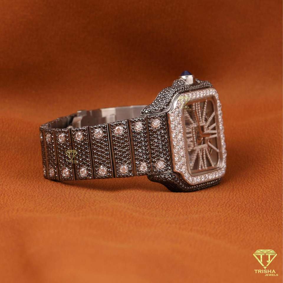 Luxury Custom Iced Skeleton Moissanite Black Diamond Watch for Men Vintage Stainless Steel Wristband Mechanical Analog Glass