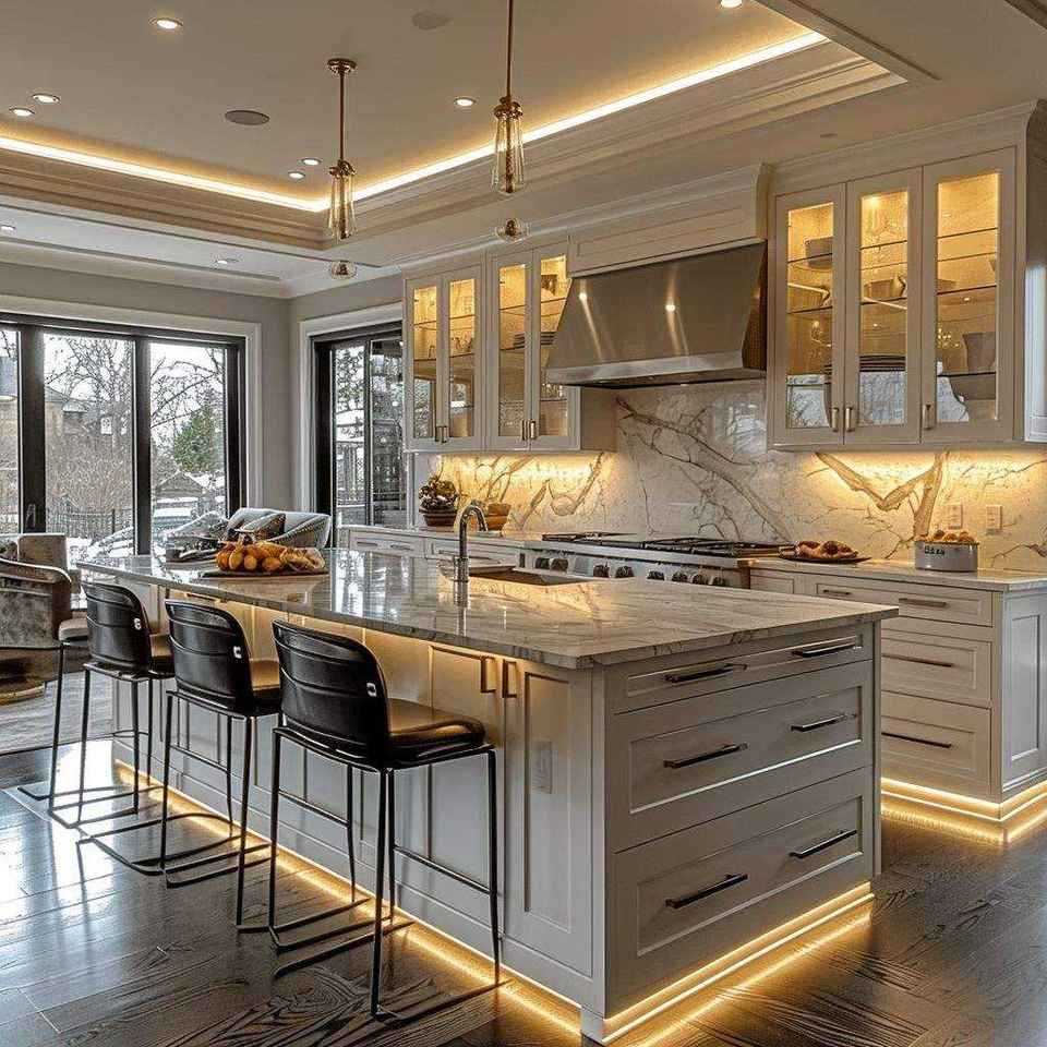 Luxury Dark Modular Kitchen With Large Island Countertop Built In Appliances And Premium Lighting For Modern Homes
