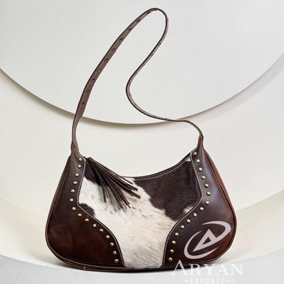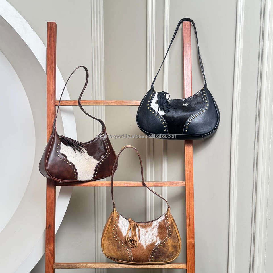 Luxury Design Cowhide Genuine Leather Half Moon Hobo Bag with Antique Brass Studs Fashionable Shoulder Messenger Bag for Women's