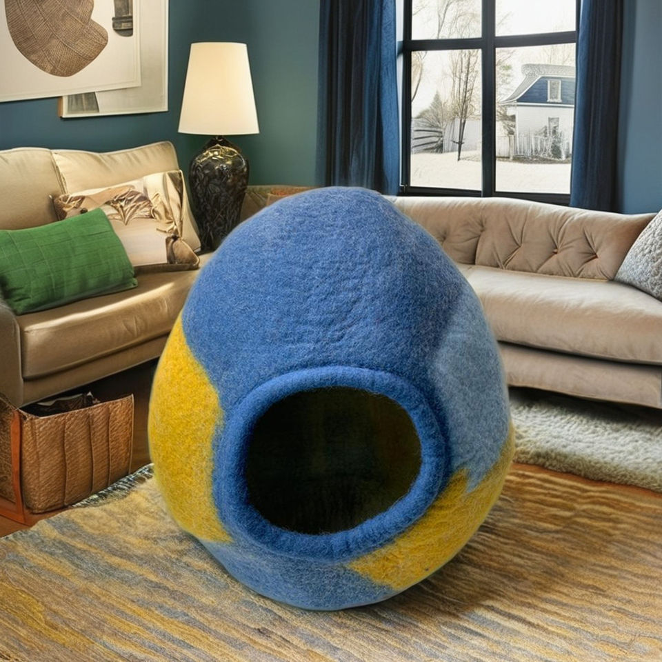 Luxury Eco-Friendly Handmade 100% New Zealand Wool Cat Cave Blue & Yellow Cozy Dome Handmade Felt Small Animal Bed Box Packed