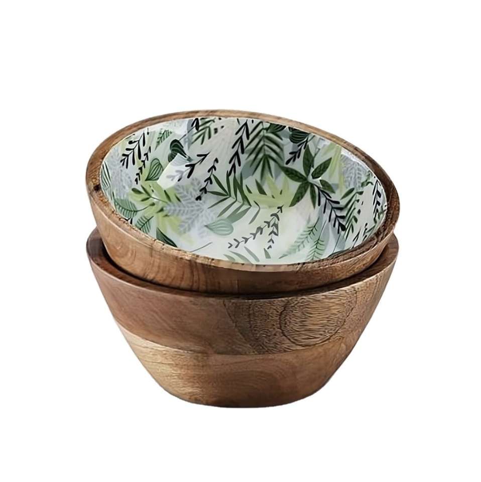 Luxury Eco-Friendly Wooden Bowl with Decorative Enamel Interior and Serving Spoons for Home & Party Gifting