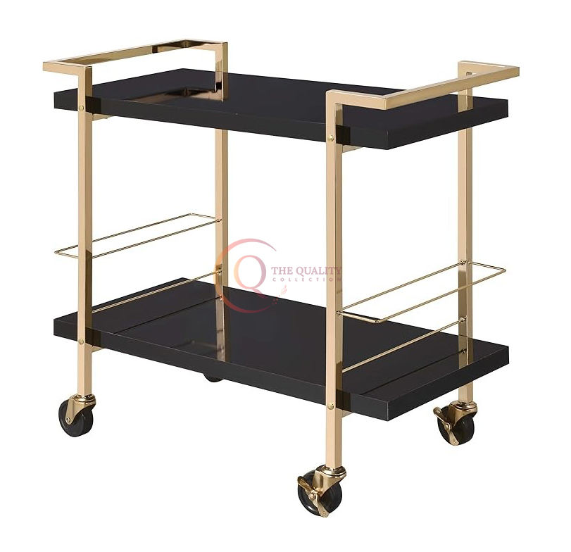 Luxury Elegant Glossy Black Wooden Bar Trolley with Gold Accents and Stylish Caster Metal Wheels Classy and Fancy Looks.
