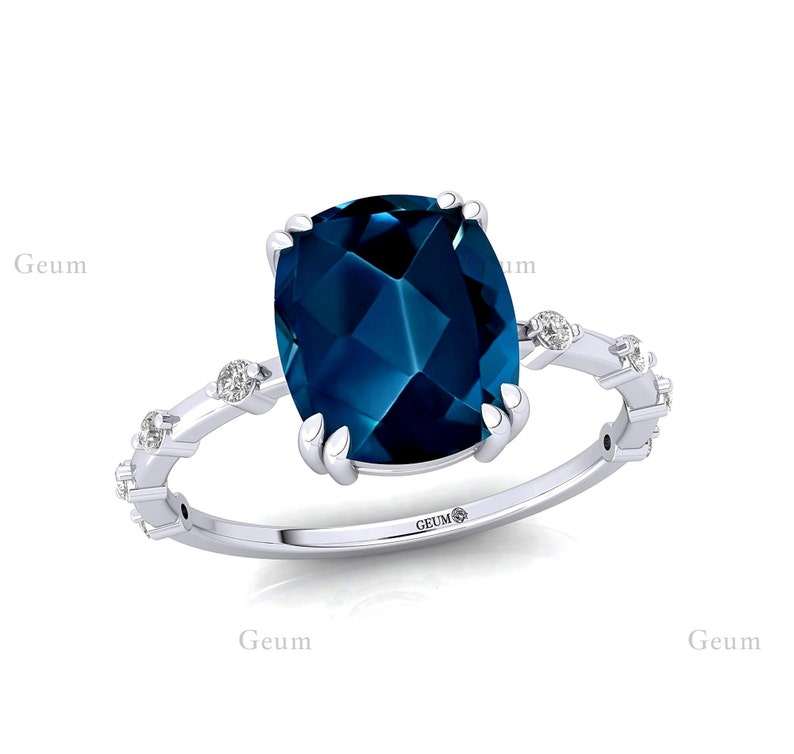 Luxury Elegant Unisex Wedding Engagement Rings Solid Gold Cushion Cut London Blue Topaz Diamond High Quality Shiny Casual Party