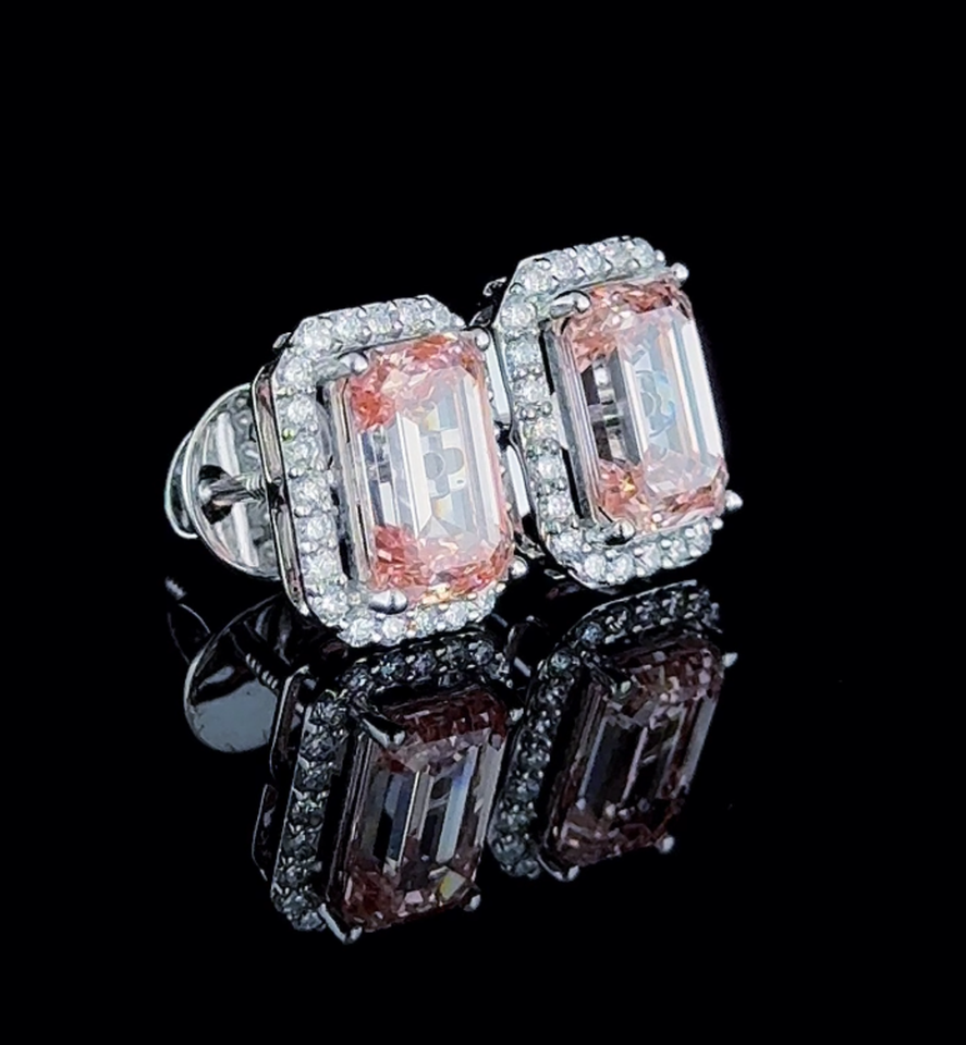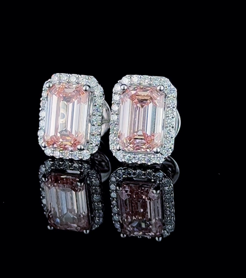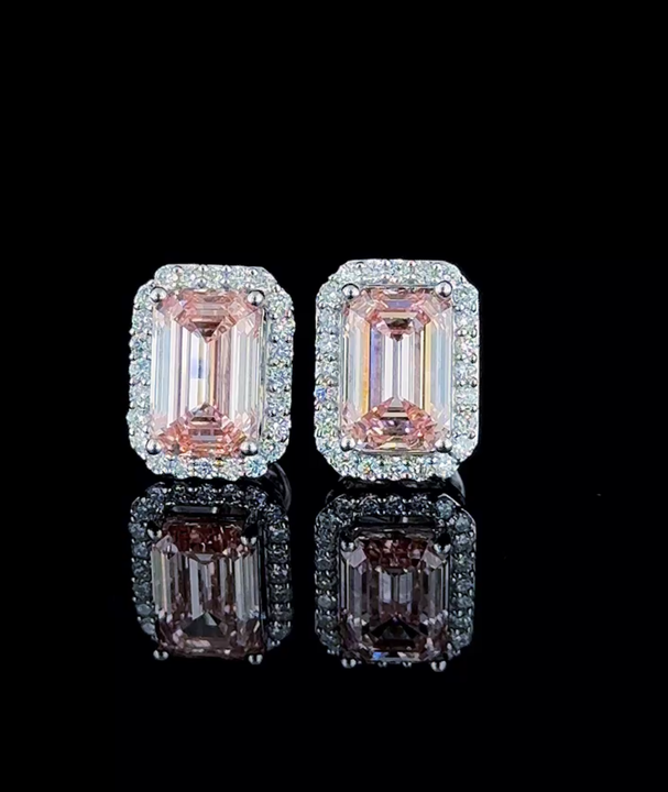 Luxury Emerald-Cut Pink Diamond Halo Stud Earrings Premium Crystal Bridal & Party Wear Earrings for Women