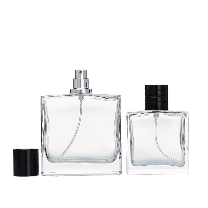 Luxury Flat Square Perfume Glass Bottle with Heavy Bottom Clear 30ml 50ml 100ml Black Lid and Crimp Pump Sprayer Empty