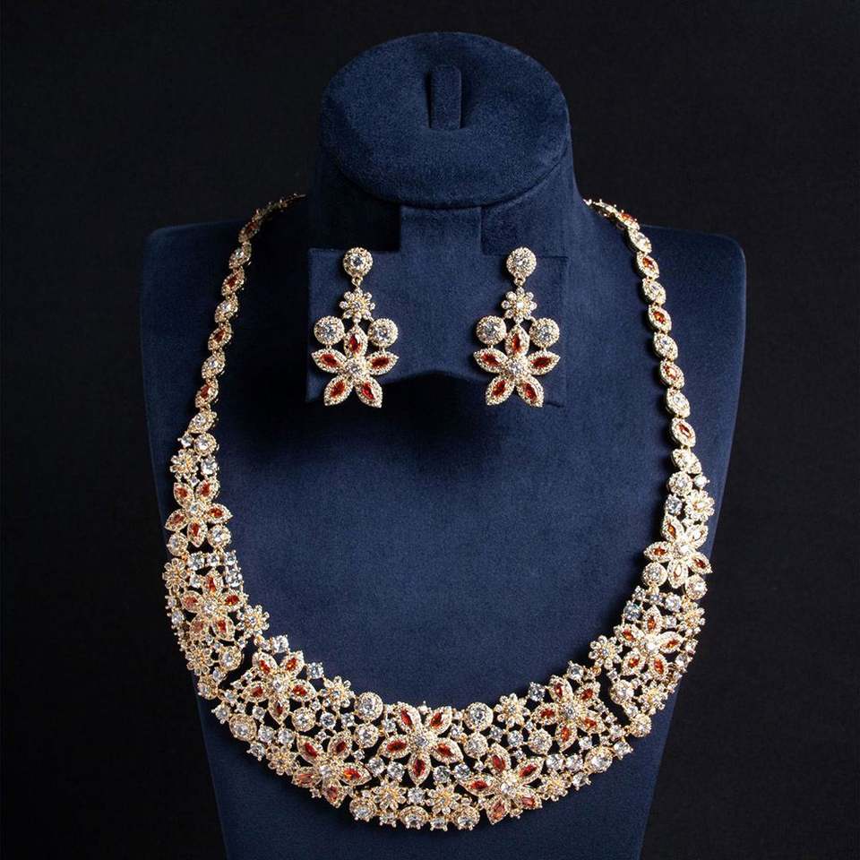 Luxury Flower Drop 2PCS Big Cubic Zircon Dubai Women Party Costume Jewelry Sets for Brides Wedding S-0011