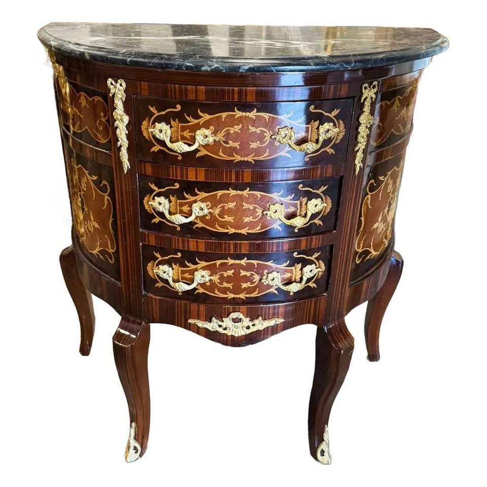 Luxury French Style Mahogany Bedside Commode Marble Top Intricate Marquetry Handcrafted Gilt Bronze Ormolu Nightstand 3 Drawers
