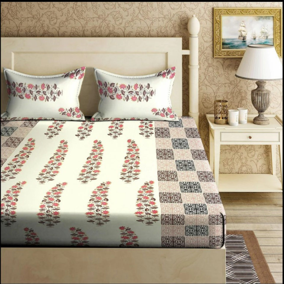 Luxury French Washed 100% Cotton Waterproof 400TC Bed Sheet Set | Floral Leaves Classic Style Bedding Flat Fitted Sheet 2