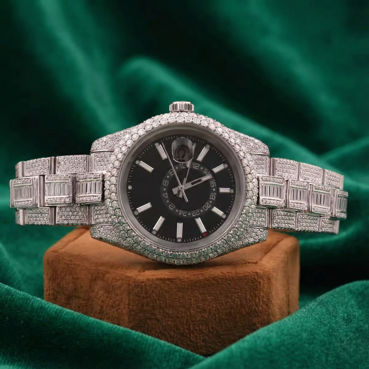 Luxury Full Iced Diamond Watch for Men | Black Dial Pavé Bezel | Baguette Bracelet | Custom Statement Hip Hop