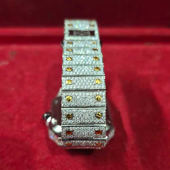 Luxury Fully Black Moissanite Automatic Quartz ETA Business Yellow Gold Leather Wristwatch Diamond Studded Iced Hip Hop Style
