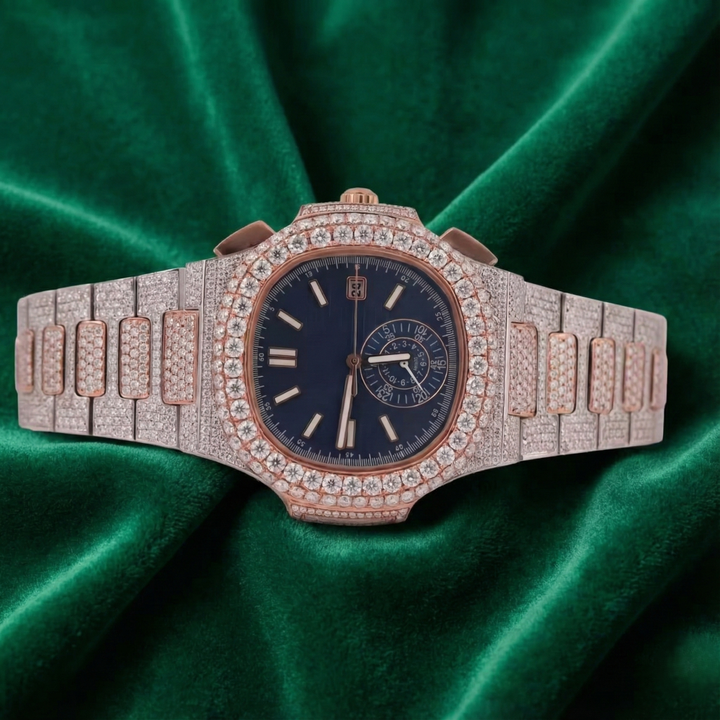 Luxury Fully Iced Moissanite Automatic Watch Two Tone Stainless Steel Blue Dial Sapphire Waterproof Diamond Style Watch