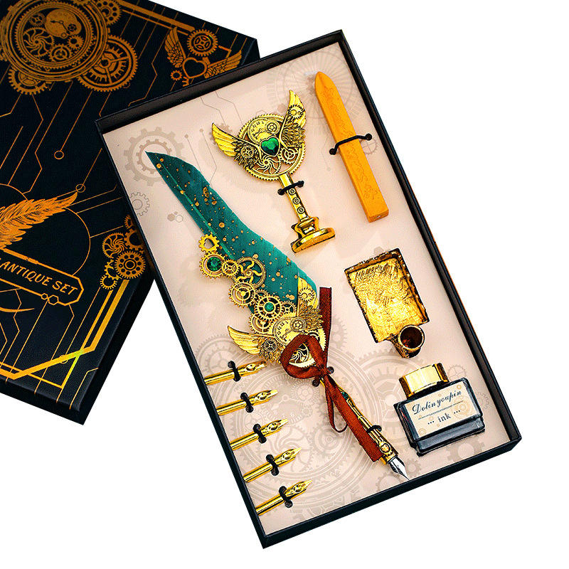 Luxury Vintage Steampunk Feather Ballpoint Pen Set Gear Embellished Non-Erasable 0.5 mm Writing Width Metal Material Black Ink