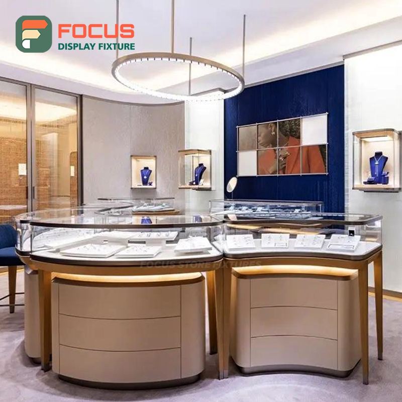 Luxury Glass Jewelry Display Cabinet Wooden Jewelry Counter Jewelry Display Rack High End LED Light Showcase Unit