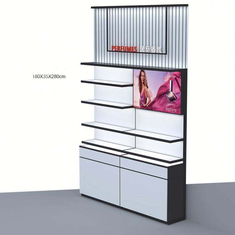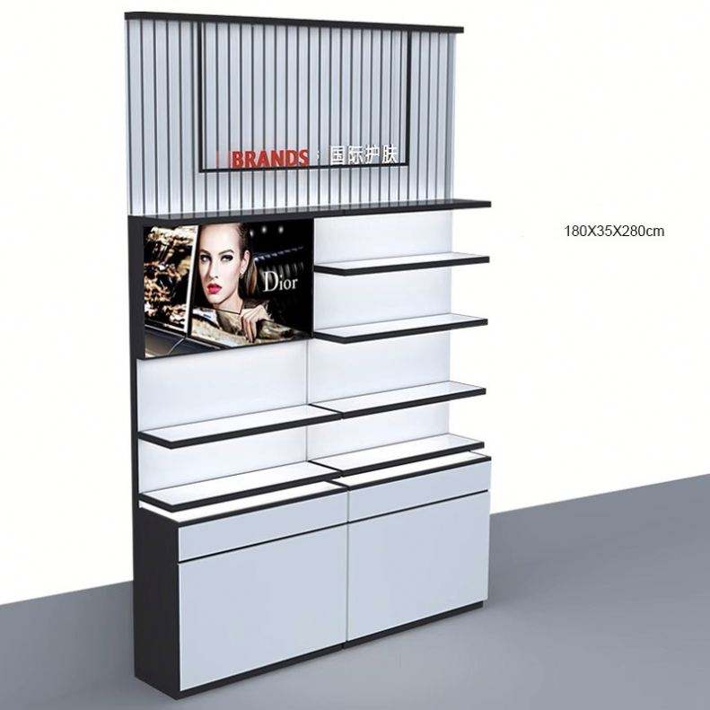 Luxury Glossy Paint Wooden Makeup Shop Display Rack Custom Beauty Cosmetic Store Display Shelf Storage Perfume Display Cabinet