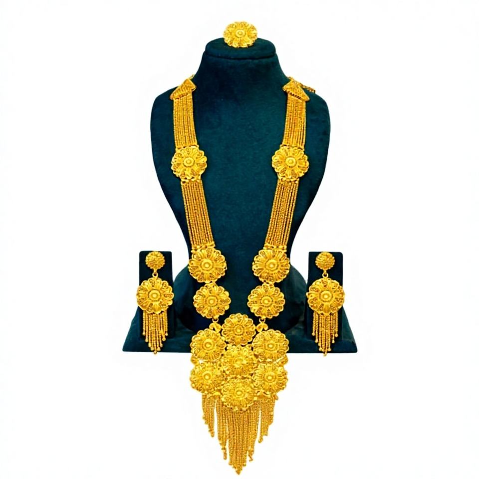 Luxury Gold Finish Floral Multi-Layer Long Necklace Set with Tassel Earrings 63143