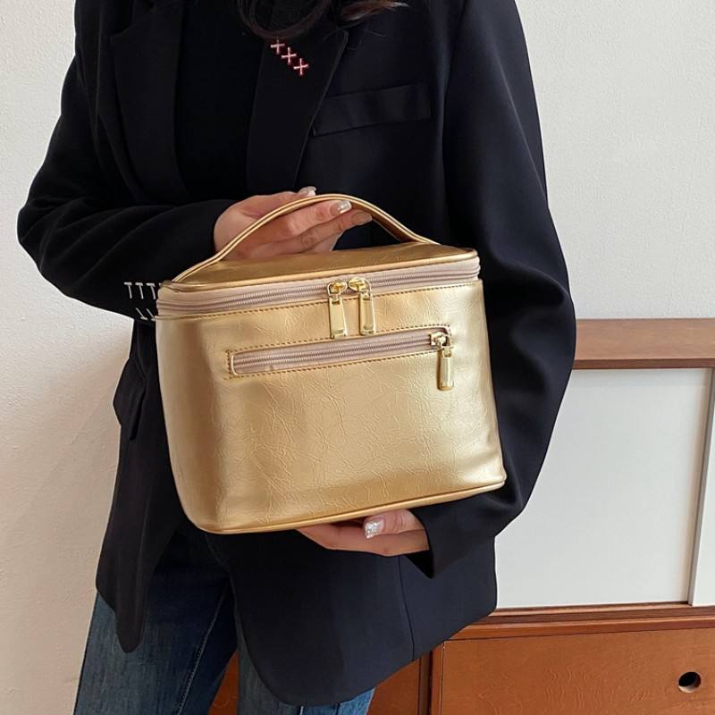 Luxury Gold PU Leather Makeup Bag Large Capacity Portable Toiletry Case Zipper Outdoor Daily Travel Cosmetic for Lady