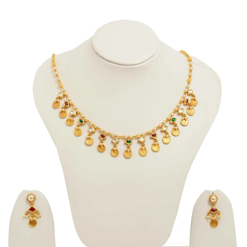 Luxury Gold Plated Pearl Chain Coin Necklace Set With Red Green Stones And Matching Earrings Traditional Wedding Jewelry