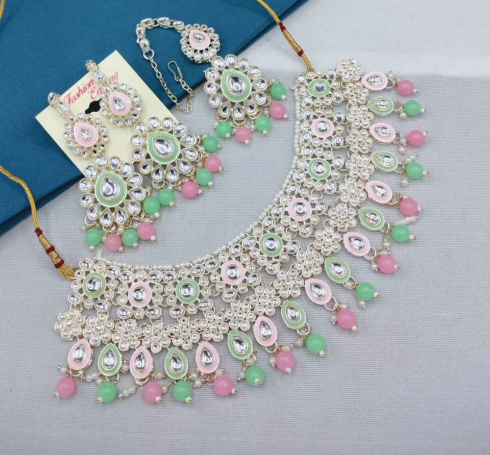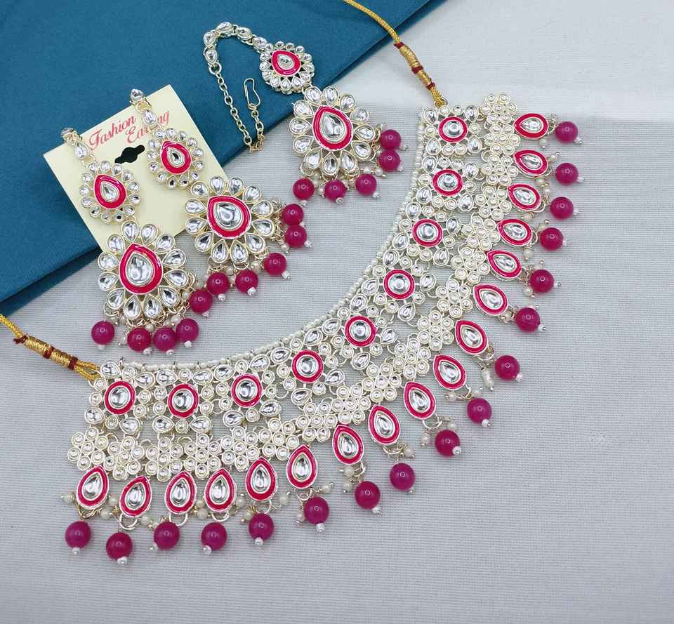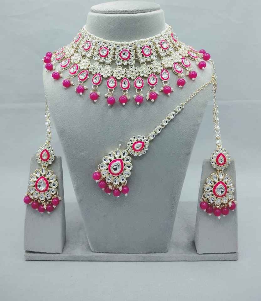 Luxury Gold Plated Pink Meenakari Zircon Bridal Jewelry Set Heavy Dulhan Necklace & Earring Tikka Set Wedding Party Wear Women