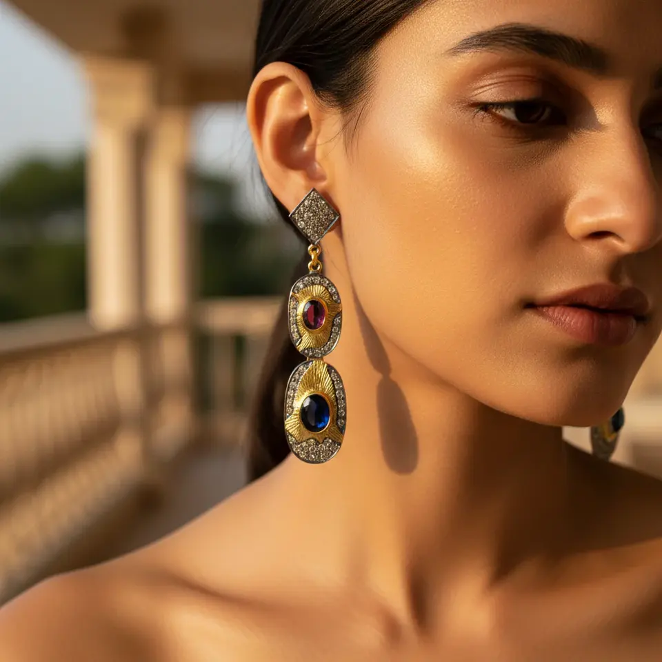 Luxury Gold Plating Ruby & Sapphire Dangle Earrings Cute Vintage Diamond Pendant Drop Earrings for Wedding Gift