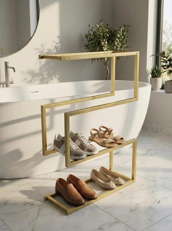 Luxury Gold Shoe Rack Three Tier Geometric Frame Space Saving Organizer Strong Stable Design Modern Home Display Storage