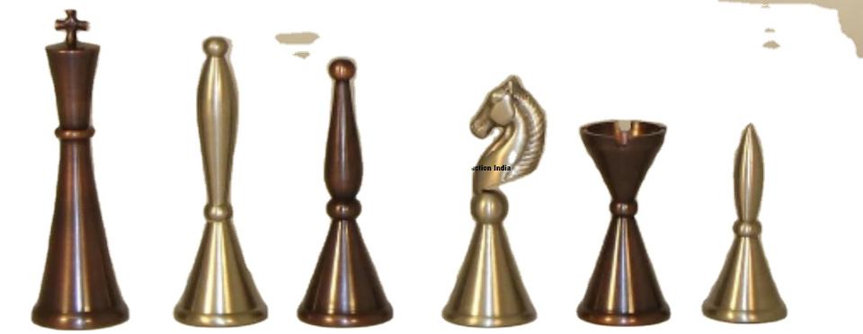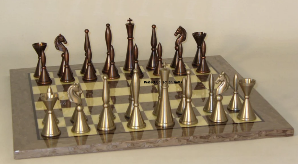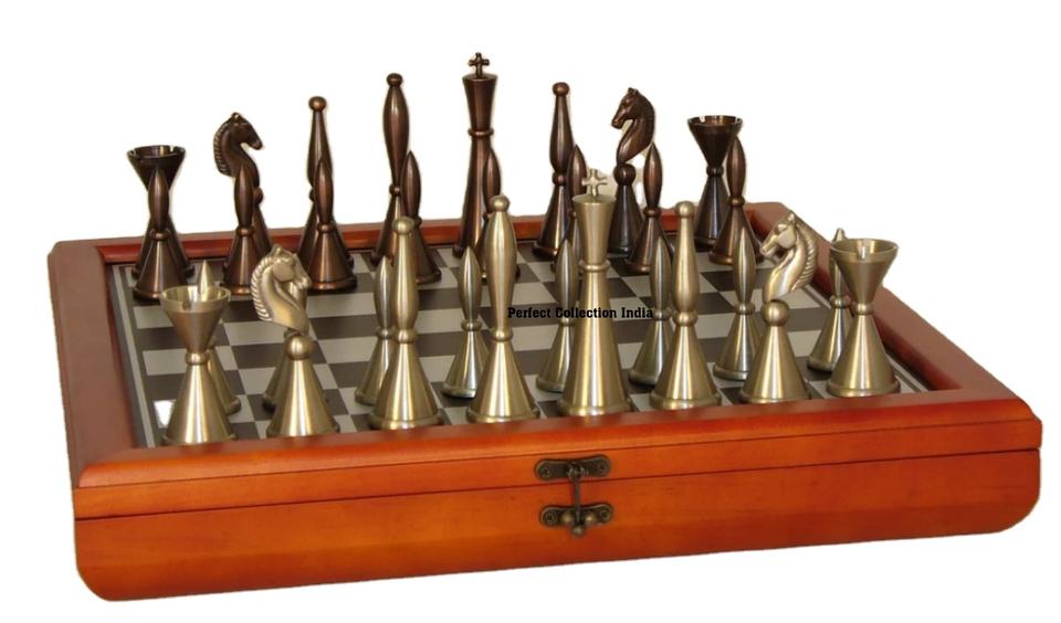 Luxury Gold & Sier Brass Art Deco Chess Set with Grey Board Wood Chess Board Box & Metal Backgammon Chips