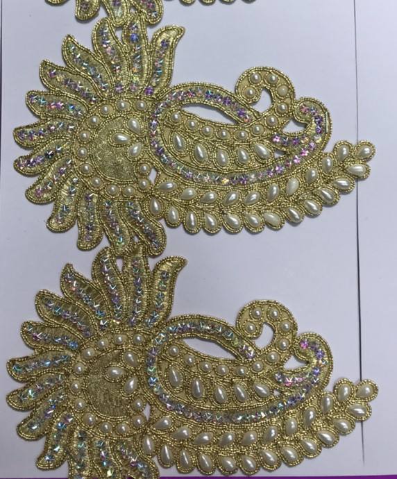 Luxury Gold Zari Mango Shape Embroidery AB Crystal Lace Trim Regal Gold and Rhinestone Floral Embellishment
