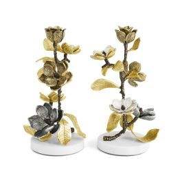 Luxury Gold and Silver Flower Candle Holder with Marble Base Metal Floral Taper Candle Stand Elegant Home Table Deco Ornament