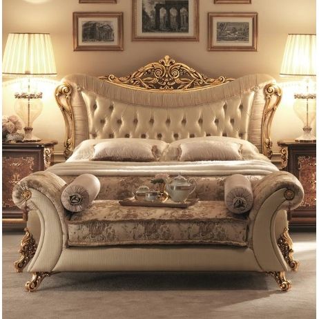 Luxury Gold Antique Bed with Upholstered Fabric Solid Mahogany Wood King Size with Ottoman Bench Classic