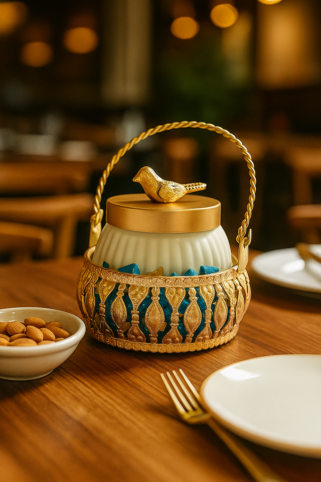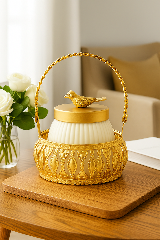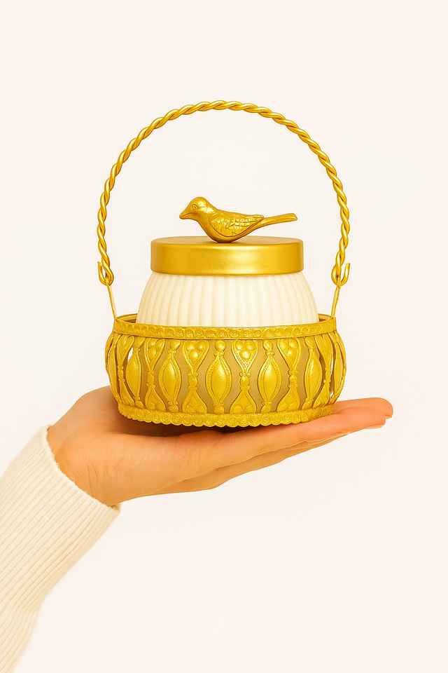 Luxury Golden Metal Basket Decorative Iron Bird Lid Candy Jar for Dining Table for Restaurants to Store Dry Fruits and Toffees