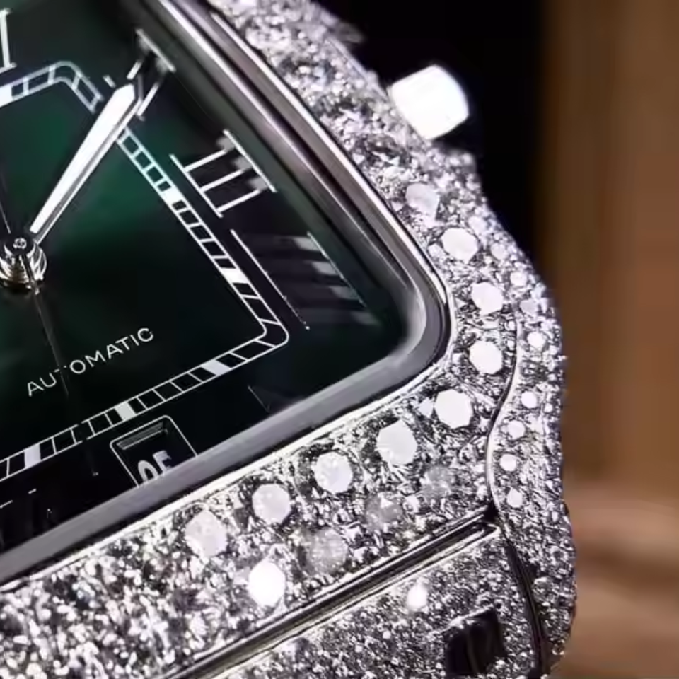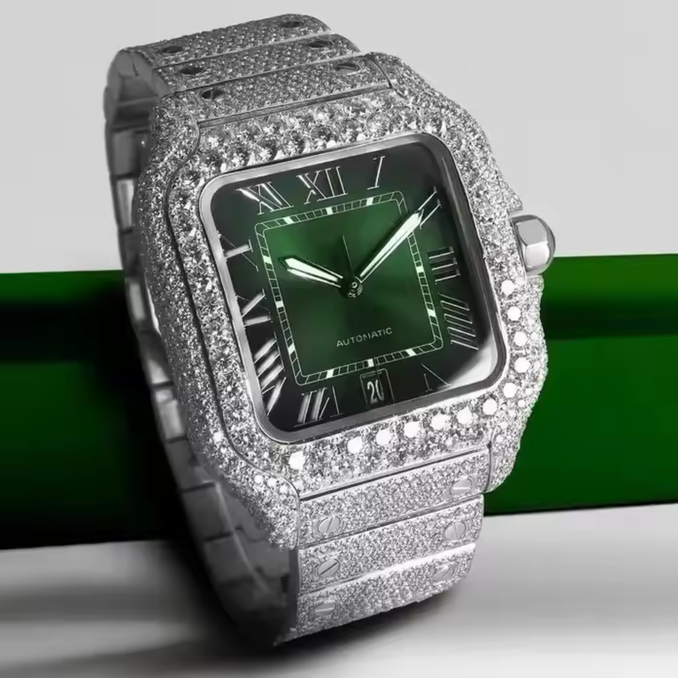 Luxury Green Dial Roman Numeral Square Moissanite Diamond Watch High Quality VVS Automatic Movement Quartz Stainless Steel Glass
