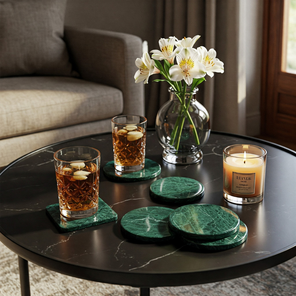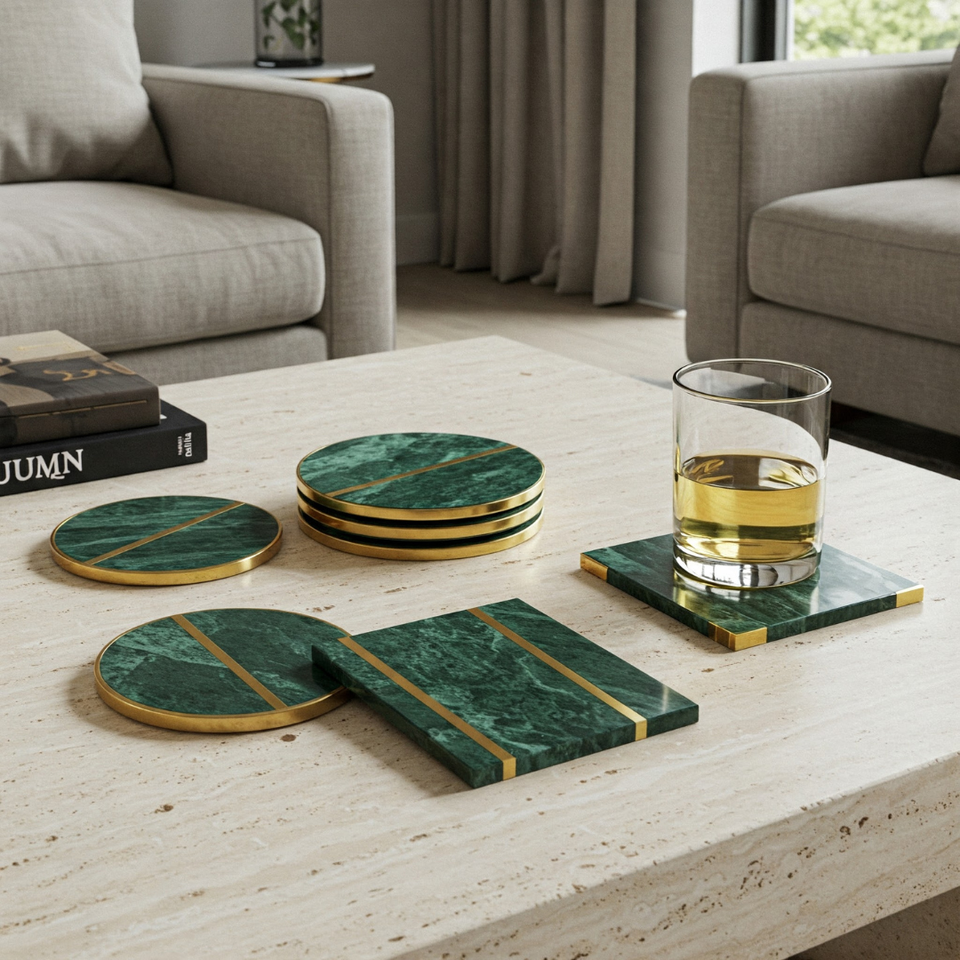 Luxury Green Marble & Brass Coaster Set Designer Home Decor 35+ Years Stone craft Expertise Alibaba Verified Bulk Discounts