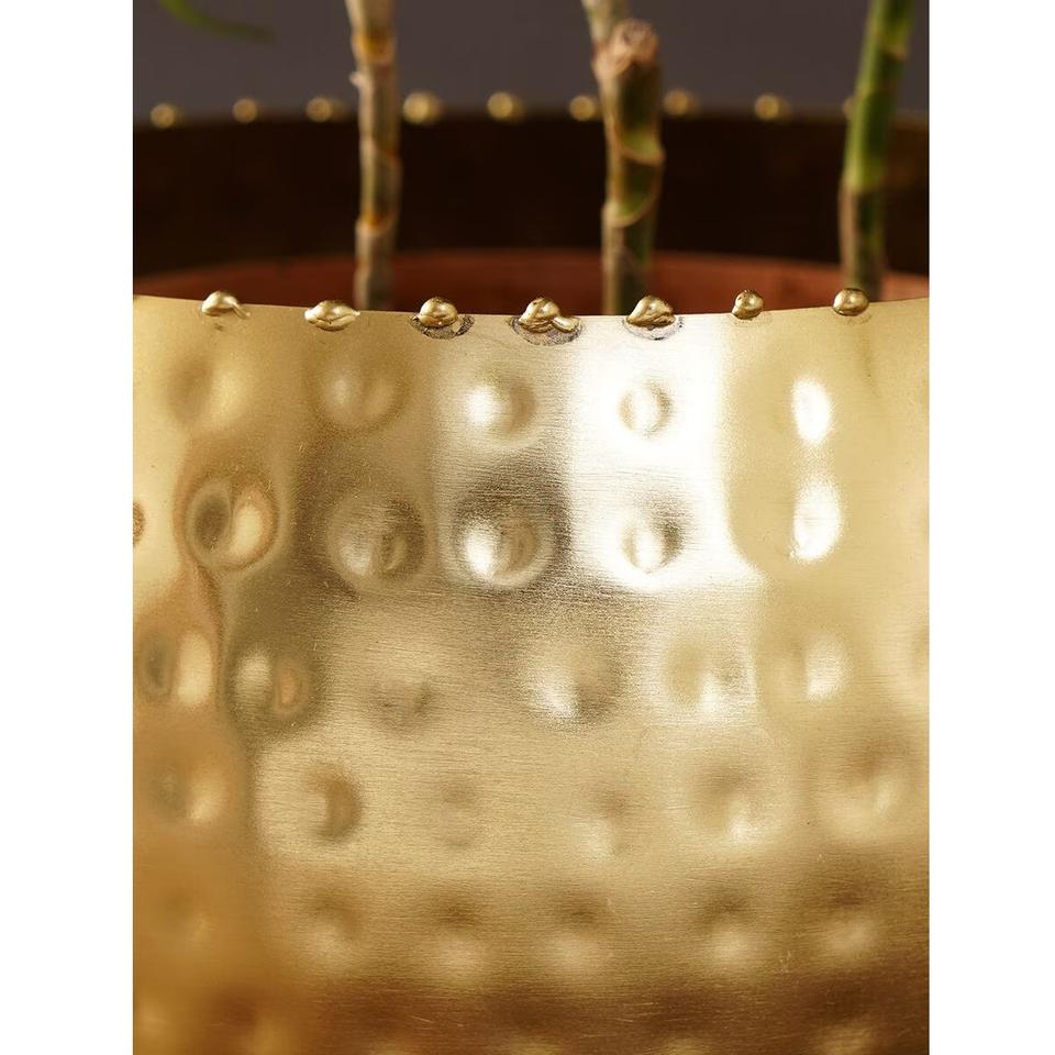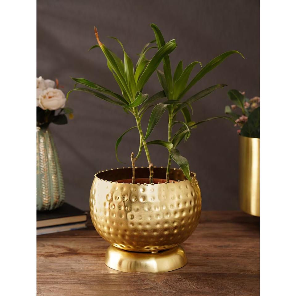 Luxury Hammered Gold Metal Tabletop Planter - Round Decorative Indoor Brass Flower Pot with Stand for Home Decor & Wedding