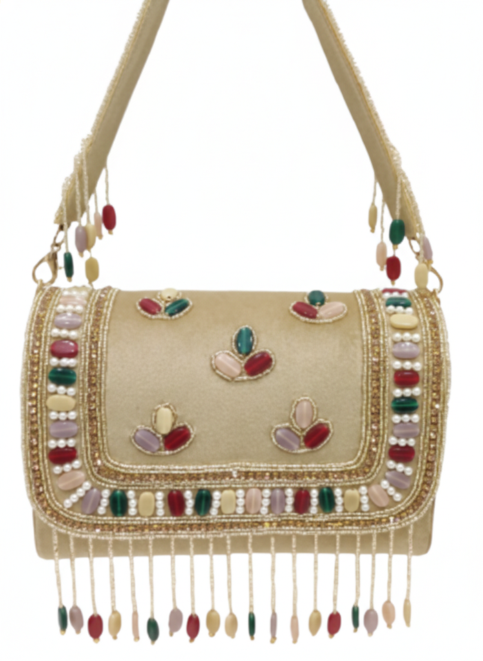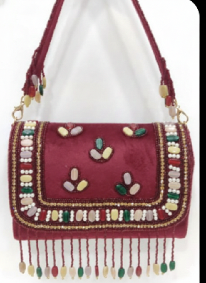 Luxury Hand-Beaded Velvet Clutch | Elegant Multi-Color Stone Evening Zipper Closure Tassels | Wholesale Party Wear Purse